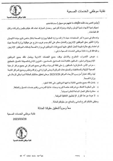 وفيما يلي نص البيان الصادر عن نقابة موظفي الخدمات الصحية: