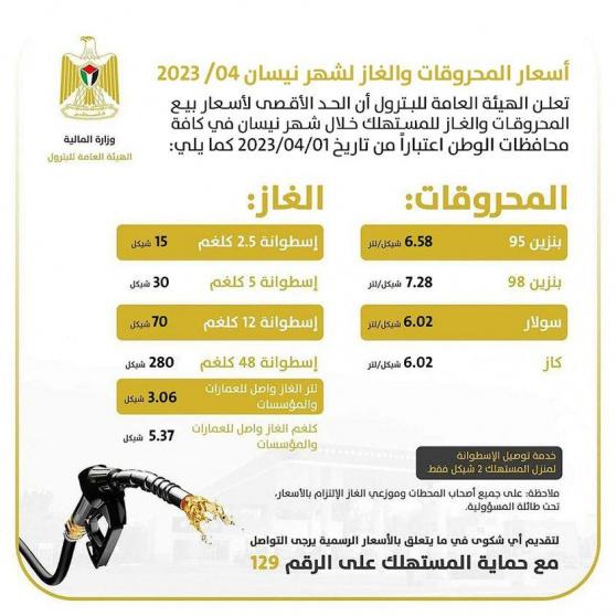 أسعار المحروقات والغاز في فلسطين لشهر 4 إبريل 2023
