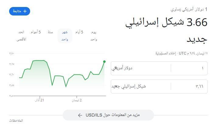 ووصل سعر صرف الدولار مقابل الشيكل الان في قطاع غزة والضفة الغربية إلى 3.66 شيكل.