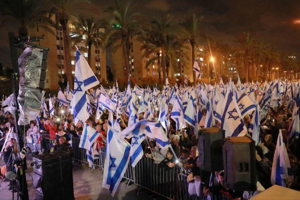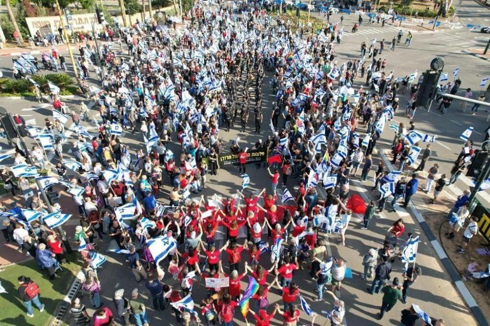 تظاهر عشرات الآلاف في تل أبيب والعديد من المفارق والبلدات ضد حكومة نتنياهو وخطة إضعاف القضاء وتقويض صلاحيات المحكمة العليا، وذلك للأسبوع الخامس عشر على التوالي.