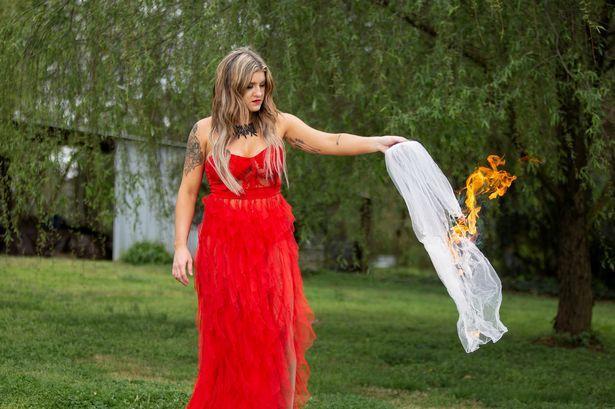 صور: أمريكية تحتفل بطلاقها بإحراق بقايا "زواجها الفاشل"