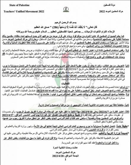 أمهل حراك المعلمين الحكومة حتى 10/9/2023 لتنفيذ مبادرة عضو اللجنة المركزية لحركة فتح جبريل الرجوب والتي طرحها من اجل وقف اضراب المعلمين.