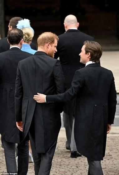 بهدوء، انضم الأمير هاري إلى 100 من رؤساء الدول والشخصيات المرموقة وممثلي الفنون والجيش والجمعيات الخيرية داخل الكنيسة، جالساً في الصف الثالث بجوار الأميرة يوجيني وزوجها جاك بروكسبانك والأميرة بياتريس، دون زوجته ميغان ماركل وطفليهما، الذين ظلّوا في الولايات المتحدة حيث مقر إقامتهم.