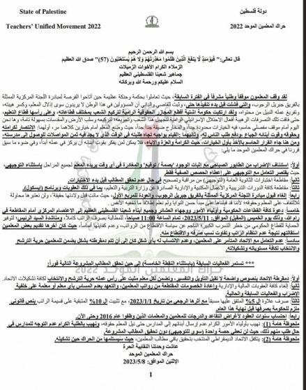 أعلن حراك المعلمين بالضفة الغربية، مساء الإثنين، استئناف الإضراب لكل المراحل باستثناء التوجيهي "مع إثبات الوجود والمغادرة في أي وقت يريده المعلم".