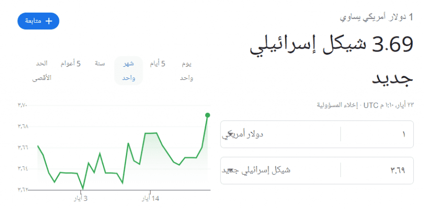 ووصل سعر صرف الدولار مقابل الشيكل الان في فلسطين إلى 3.69 شيكل.