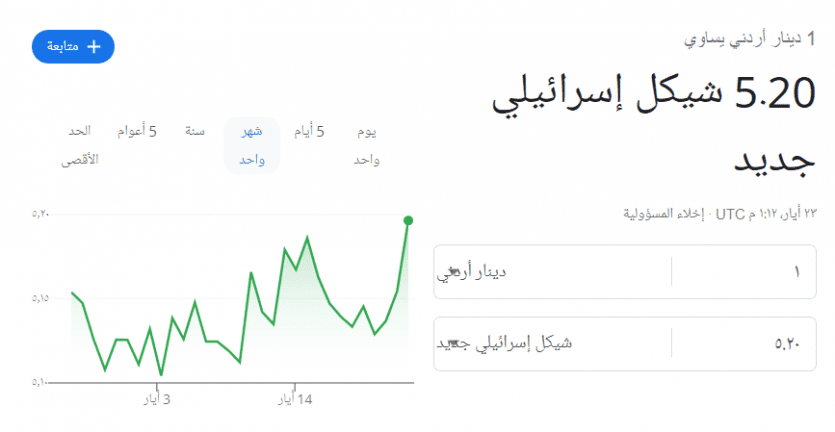 كما ارتفع سعر صرف الدينار الأردني مقابل الشيكل الإسرائيلي مساء الويم، ليصل إلى 5.20 شيكل، بعد أن كان يصرف صباح اليوم بسعر 5.16.