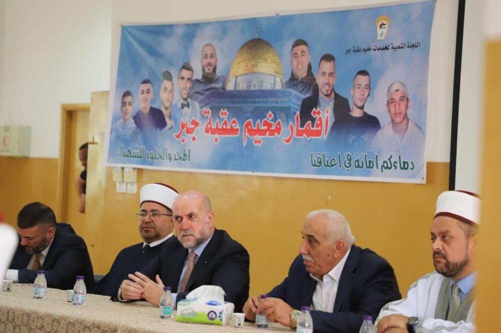 وبعد ذلك توجه الهباش وأبو العسل لمخيم عقبة جبر والتقى بأهالي شهداء المخيم الذي سقطوا برصاص الاحتلال الإسرائيلي خلال الحملة الإسرائيلة المستمرة ضد أهالي المخيم والتي حصدت أرواح خيرة شبابه، حيث أكد الهباش خلال اللقاء الذي تم في مقر اللجنة الشعبية لخدمات مخيم عقبة جبر وبحضور رئيس اللجنة الأخ جمال عمر أن الكلام يبقى عاجزاً في حضرة الشهداء وأهالي الشهداء، مؤكداً أننا جميعاً مستهدفون وجميعاً مشاريع شهادة دفاعاً عن حقنا في وطننا وقدسنا، معرباً عن تعازيه الحارة لذوي الشهداء وعائلاتهم ولعموم أبناء مخيم عقبة جبر، حيث نقل لهم تحيات الرئيس محمود عباس وتعازيه لهم باستشهاد أبنائهم ومؤكداً لهم وقوف القيادة الفلسطينية إلى جانبهم وأنه اليوم في المخيم للاستماع لهم والاطلاع عن كثب على احتياجاتهم ومؤازرتهم ومساندتهم في هذا المصاب الجلل.