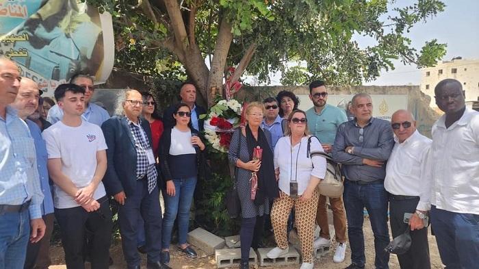 وفد الاتحاد الدولي للصحفيين يضع إكليل زهور بموقع اغتيال أبو عاقلة