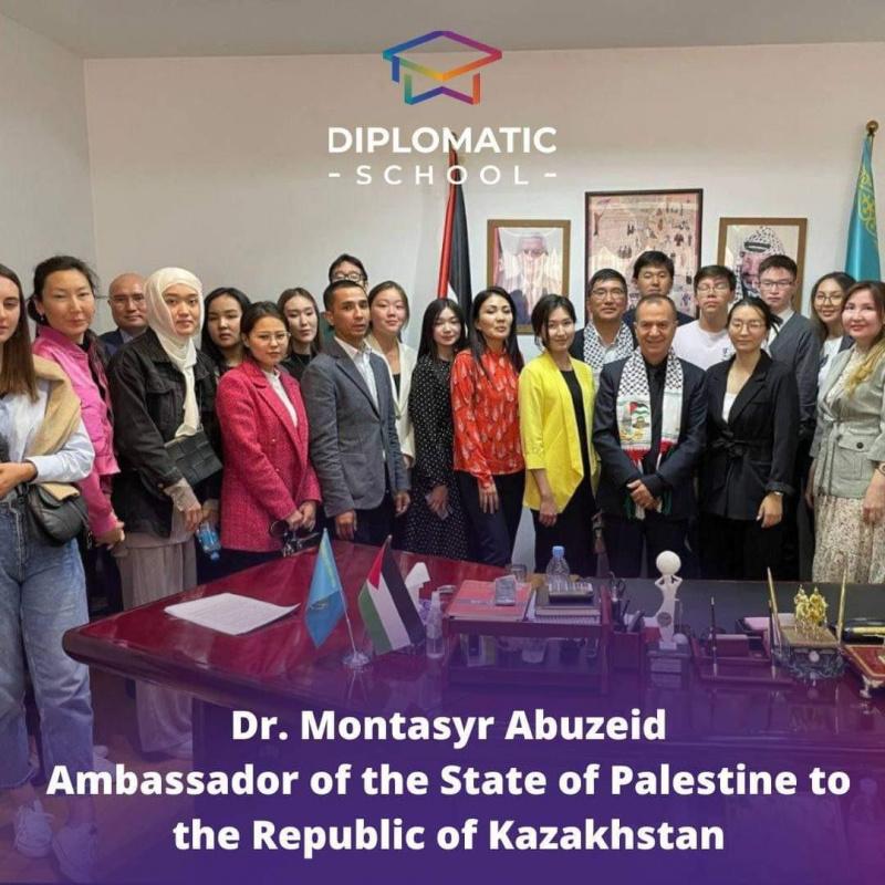 طلاب المدرسة الدبلوماسية الكازاخستانية ينظمون زيارة تضامنية للسفارة الفلسطينية