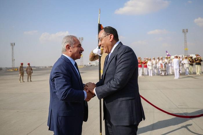 وكان في استقبال رئيس الوزراء في الصالة الحكومية بمطار القاهرة الدولي، نظيره المصري مصطفى مدبولي، ووزراء الحكومة المصرية، وسفير دولة فلسطين لدى مصر دياب اللوح، ومستشارو السفارة.