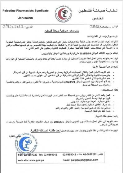 قررت نقابة صيادلة فلسطين، مساء اليوم ، اتخاذ إجراءات نقابية جديدة احتجاجًا على عدم استجابة الحكومة لتحقيق المطالب التي كان تم الاتفاق على تنفيذها.