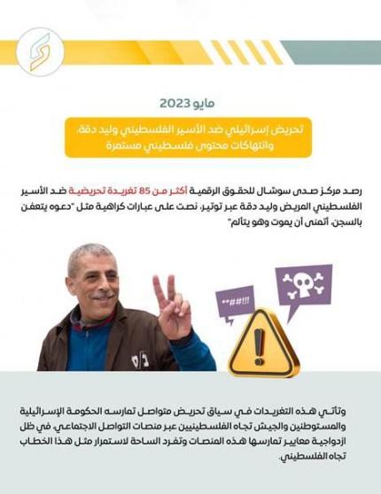 رصد مركز صدى سوشال للحقوق الرقمية أكثر من 85 تغريدة تحريضية ضد الأسير الفلسطيني المريض وليد دقة عبر توتير، نصت على عبارات كراهية مثل "دعوه يتعفن بالسجن، أتمنى أن يموت وهو يتألم"