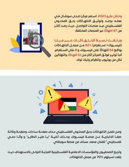 وخلال مايو 2023، استمر مركز صدى سوشال في عمله برصد وتوثيق الانتهاكات بحق المحتوى الفلسطيني عبد منصات التواصل، حيث رصد أكثر من 87 انتهاكًا عبر المنصات المختلفة.