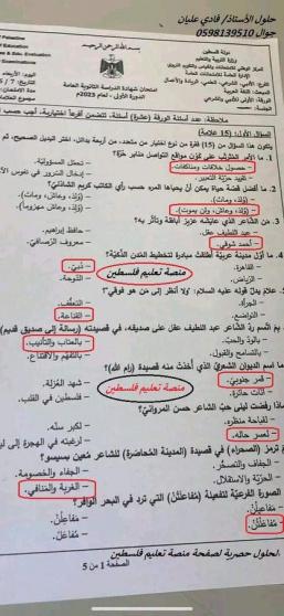 حل إجابة أسئلة امتحان اللغة العربية توجيهي فلسطين الثانوية العامة 2023