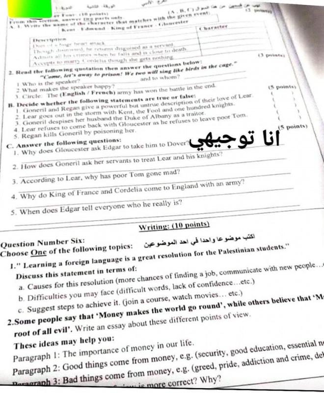 امتحان اللغة الإنجليزية "الانجليزي" سواء الورقة الأولى أو الثانية لطلبة الثانوية العامة توجيهي فلسطين يعتبر من أهم وأصعب الامتحانات التي يتقدم بها الطلبة بكافة الفروع إذ ينتظر الطلبة يوم الامتحان للانتهاء منه وتقييم الحلول.