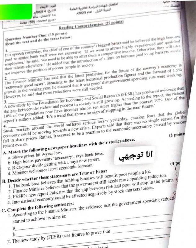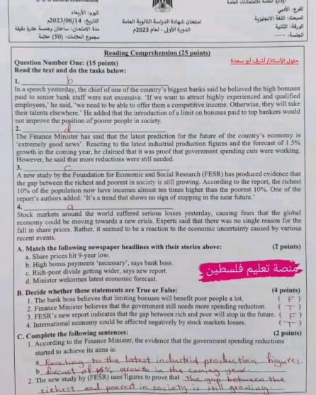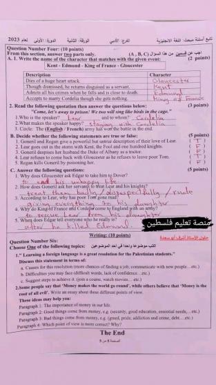 أجوبة امتحان الانجليزي توجيهي فلسطين 2023 الأدبي وهي الورقة الثانية بعد أن تقدم الطلبة في كافة الفروع لامتحان الورقة الأولى يوم الاثنين الماضي حيث تباينت آراء الطلبة مع ترجيح الجميع بأن الامتحان كان صعبا وطويلا.