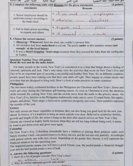 حلول امتحان الانجليزي الورقة الثانية توجيهي فلسطين 2023