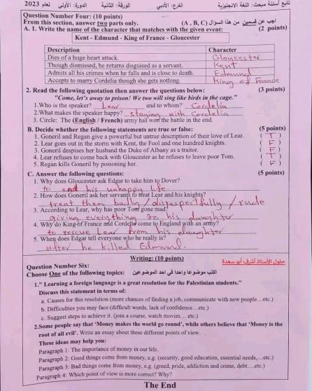 إجابات امتحان اللغة الإنجليزية الورقة الثانية توجيهي فلسطين 2023 الأدبي