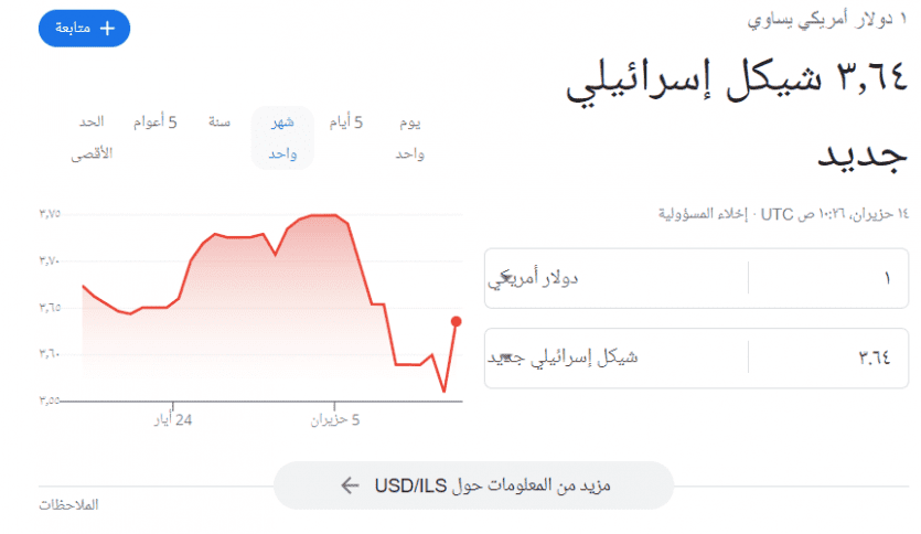 وبلغ سعر الصرف في الشاشة أكثر من 3.64 شيكلا لكل واحد دولار بعد أن كان صباح اليوم 3.55.