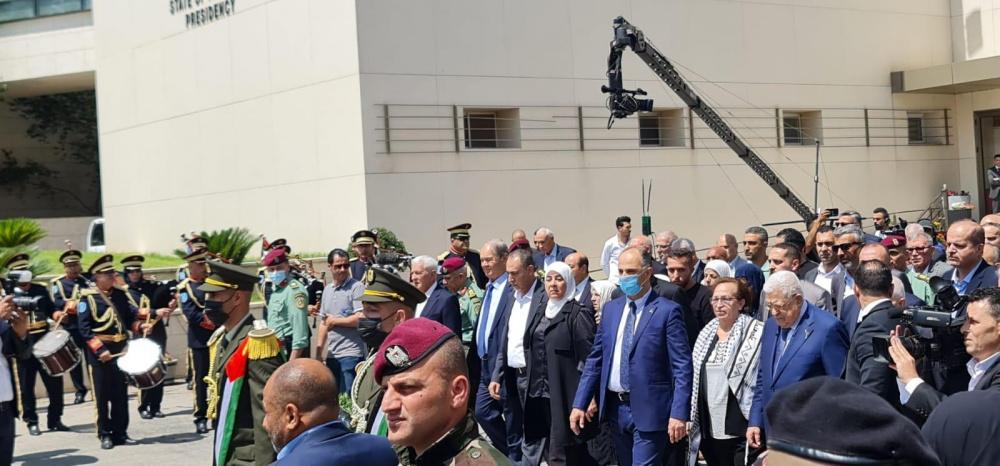 وألقى الرئيس عباس، نظرة الوداع الأخيرة على جثمان المناضل الوطني قدري أبو بكر، ووضع على نعشه إكليلا من الزهور.