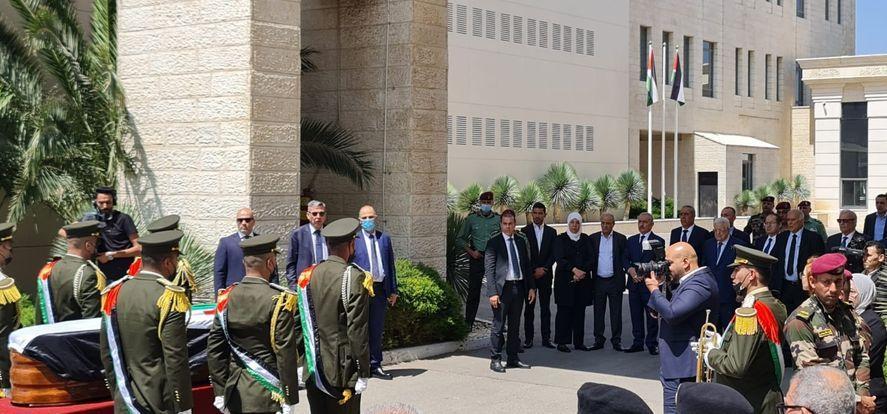 واصطف حرس الشرف أثناء وصول جثمان المناضل الكبير إلى مقر الرئاسة، وحُمل نعشه على الأكتاف، مرورا أمام ثلة من حرس الشرف، وعُزف النشيد الوطني الفلسطيني وموسيقى جنائزية.