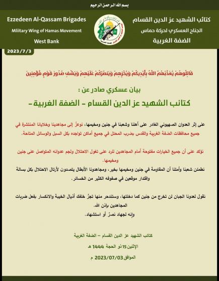"القسام" بالضفة تنشر بيانا رسميًا مهمًا حول معركة جنين