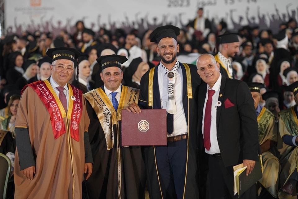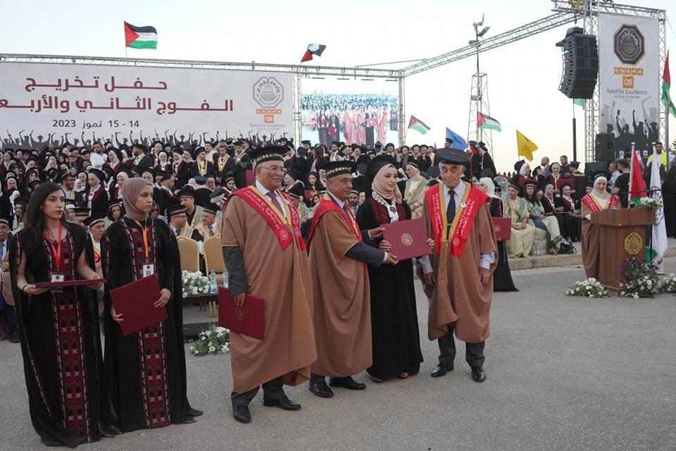 من جانبه، أبرق رئيس جامعة القدس أ.د. أبو كشك تحياته لذوي الأسرى الخمسين الذين يتخرجون اليوم في الدراسات العليا في جامعة القدس، وهنأ مختلف الطلبة الخريجين وذويهم بهذه الكوكبة المتميزة من الطلبة الذين حرصت الجامعة على تمكينهم في البحث العلمي وفرص التبادل الطلابي والثقافي والتدريب المستدام مع الجامعات العالمية، وتوظيف أحدث التقنيات التعليمية وتأسيس الحاضنات الريادية التي من شأنها استثمار طاقات الطلبة في التفكير الإبداعي والريادي وتعزيز ثقتهم وإبداعهم ومعارفهم، لتستحق الجامعة بذلك تقدمها على المستوى الوطني والإقليمي والدولي بحصولها على الترتيب الأول بين الجامعات الفلسطينية والترتيب 1060 على العالم وتقييم 5 نجوم وفقًا للتصنيف العالمي للجودة الأكاديمية QS للعام 2023.