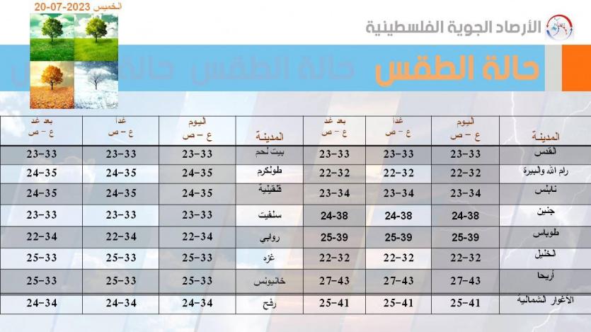 من جهتها، قالت دائرة الارصاد الجوية، إن الجو اليوم الخميس، يكون حارا إلى شديد الحرارة، فيما تكون درجات الحرارة أعلى من معدلها السنوي بحدود 5 درجات.