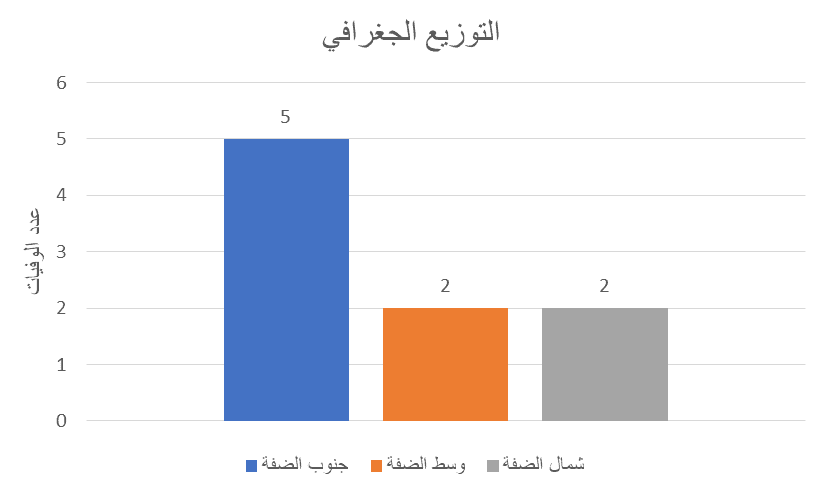 من الناحية الجغرافية، فقد سُجّلت 5 وفيات في جنوب الضفة الغربية تحديدا في مدينة الخليل، وكذلك وفاتان في الوسط (القدس ورام الله)، ووفاتان أيضاً في الشمال في مدينة نابلس وقضائها. وتعتبر زيادة الحوادث المُميتة في أي منطقة مؤشراً لضعف ثقافة السلامة والصحة المهنية في تلك المنطقة وقلة الحملات التفتيشية والإرشادية، وهذا بدوره يشكل دافعاً للجهات المختصة لتكثيف الحملات التوعوية والإرشادية للعاملين وأصحاب العمل حول مسببات هذه الحوادث والوفيات في هذه المناطق.
