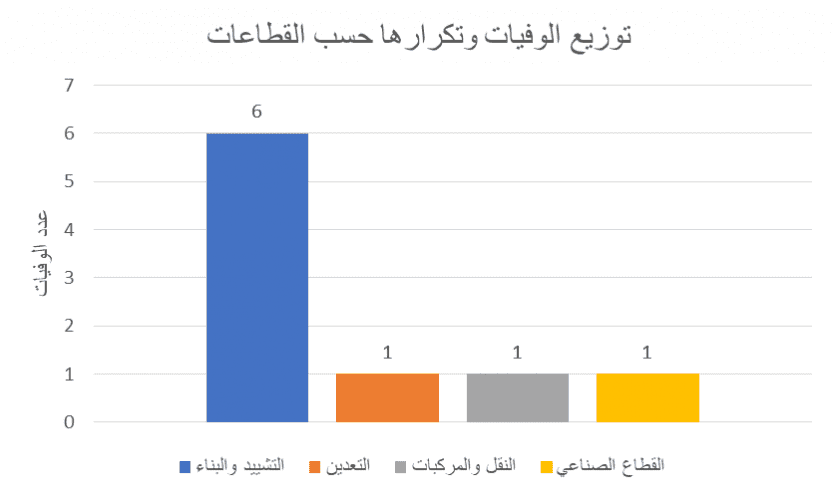 ووفق التقرير، منذ بداية العام، سُجّلتْ 9 وفيات مهنية، 6 منها في قطاع التشييد والبناء جلُّها بسبب السقوط من علوّ، ووفاة واحدة في القطاع الصناعي بسبب السقوط في بئر مصعد، ووفاة أيضاً في قطاع التعدين بانقلاب جرافة، وكذلك وفاة أخرى في قطاع النقل بسبب انقلاب شاحنة. ويعتبر عدد الوفيات لهذا العام أقل بنسبة 30% مقارنة بالعام الماضي؛ حيث سجلت 13 وفاة مهنية.