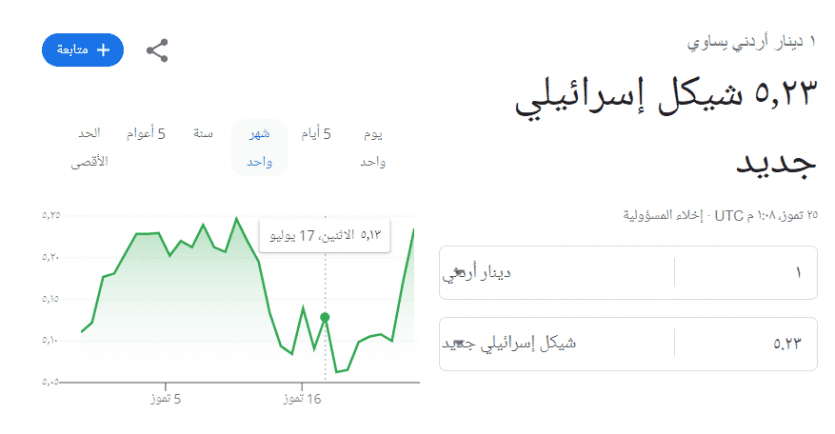 وبلغ سعر صرف الدينار الآن مقابل الشيكل عند 5.23 بعد أن سجل صباح اليوم 5.17 شيكل.
