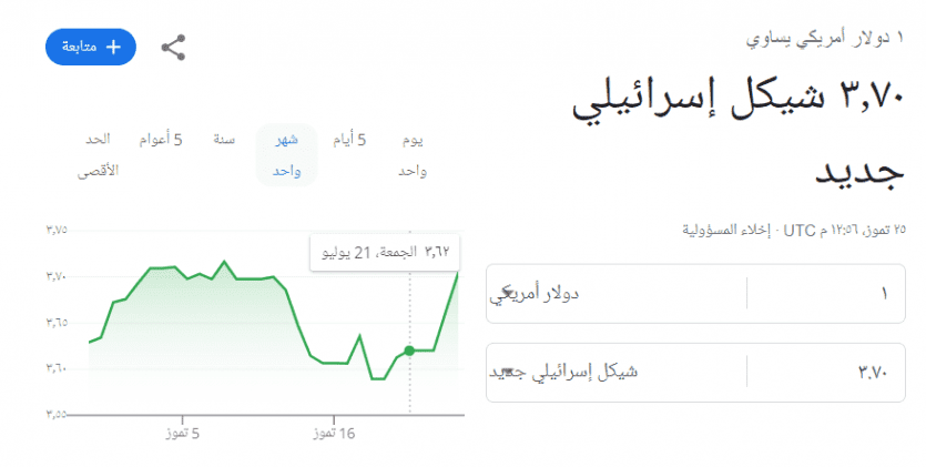 وبلغ سعر صرف الدولار الآن مقابل الشيكل عند 3.70 بعد أن سجل صباح اليوم 3.66 شيكل.