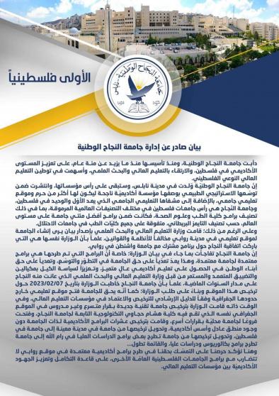 وتابعت الجامعة: "إنّ جامعة النجاح تفاجأت بما جاء في بيان الوزارة؛ خاصة أنّ البرامج التي تم طرحها هي برامج معتمدة لجامعة معتمدة، وهذا يعدّ تعدّياً على حق الجامعة في التطوّر والتوسّع، وتعدياً على حق أبناء الوطن في الحصول على تعليم أكاديمي عالٍ متميز، وتعزيزاً لسياسة الكيل بمكيالين والتضييق المتعمد والمستمر من قبل وزارة التعليم العالي والبحث العلمي الذي عانت منه النجاح على مدار السنوات الماضية".