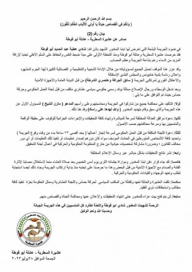 وأوضحت العائلة في بيان لها، أنها حرصت على مبدأ ضبط النفس والحفاظ على السلم الأهلي تجنباً لإراقة الدماء رغم بشاعة الجريمة وعظم المصاب، مشيرةً إلى أن ذلك دفع الجميع لتحمل مسؤولياته من خلال الإدانة الشعبية والتنظيمية والفصائلية الكبيرة لهذا الجرم. كما وصفته.