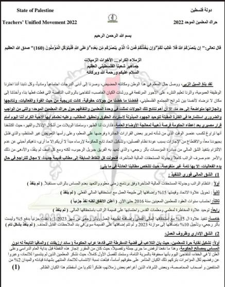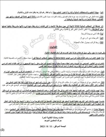 وتابع الحراك "لن نفتتح العام الدراسي الجديد إلا بتحقيق كل المطالب، ولذلك فالإضراب يشمل التوجيهي ولن نُعطي حصة واحدة".