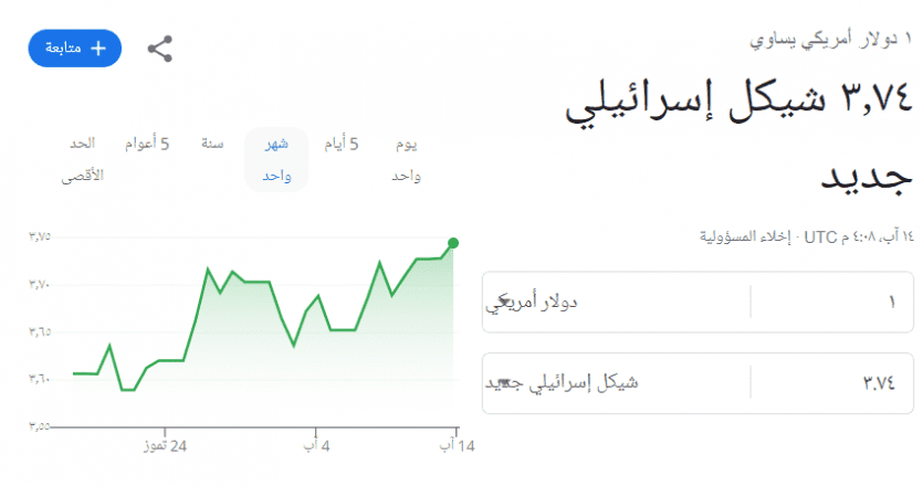 وصرف الدولار مساء اليوم الاثنين بـ 3.75 شيقلا ، وهو اعلى مستوى يبلغه الدولار مقابل الشيقل منذ عدة سنوات.