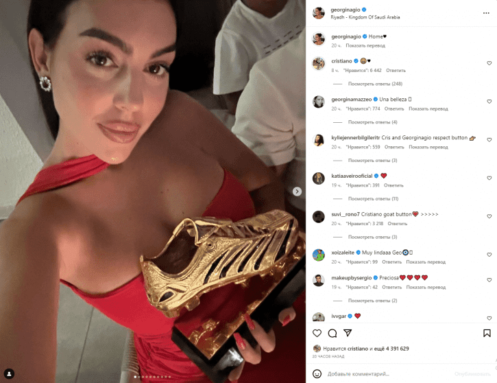 وظهرت جورجينا رودريغيز في إحدى الصور المنشورة عبر حسابها على موقع "إنستغرام" وهي ترتدي فستانا أحمر اللون، وتحمل جائزة هداف بطولة كأس الملك سلمان التي حسمها رونالدو "صاروخ ماديرا" لصالحه برصيد 5 أهداف.