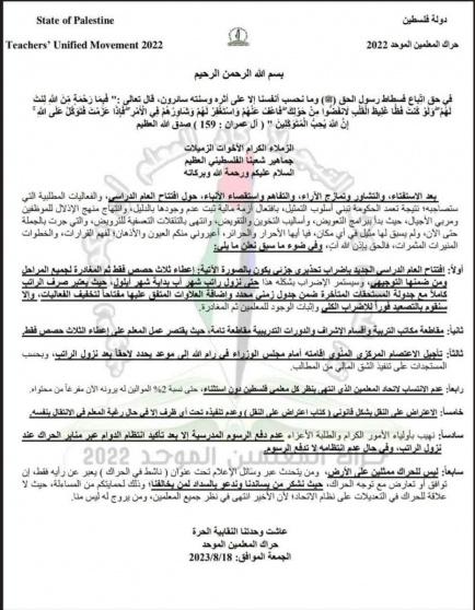 وقال الحراك في بيان له: "إن الإضراب الجزئي سيكون عبر إعطاء ثلاث حصص فقط ثم المغادرة لجميع المراحل ومن ضمنها التوجيهي".
