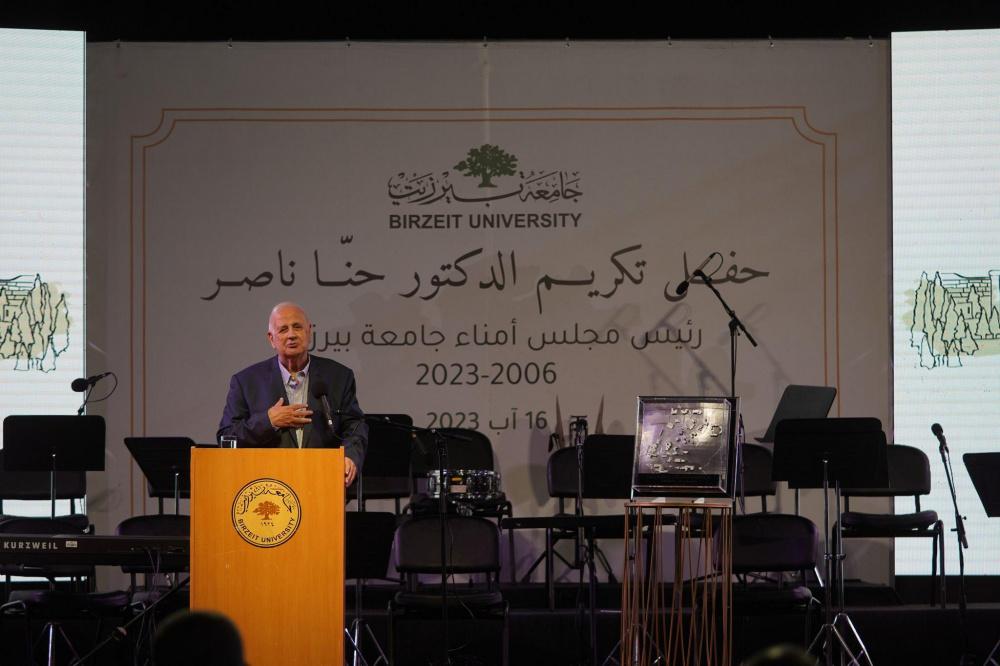 تقديراً لعطائه ولمسيرته الأكاديمية والوطنية، نظم مجلس أمناء جامعة بيرزيت حفل تكريم لرئيس مجلس أمنائها السابق د. حنا ناصر لمناسبة انتهاء مهامه كرئيس للمجلس، والذي شغل رئاسته منذ العام 2006 حتى 15 آب 2023، وذلك بحضور رئيسة مجلس الأمناء د. حنان عشراوي وأعضاء مجلس الأمناء، ورئيس الجامعة د. طلال شهوان وأعضاء مجلس الجامعة، ووزير الداخلية زياد هب الريح، ووزير العمل د. نصري أبو جيش، ووزيرة الصحة د. مي كيلة، ووزيرة المرأة د. آمال حمد، ووزير الزراعة رياض عطاري ومحافظ محافظة رام الله والبيرة د. ليلى غنام وعدد كبير من الشخصيات الوطنية والسياسية والاقتصادية وعائلة د. ناصر.