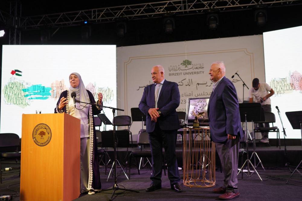 ومن ثم قامت رئيسة مجلس الأمناء د. حنان عشراوي بتكريم د. ناصر بعمل فني يجسد جامعة بيرزيت، وأكدت أن مغادرة د. ناصر لرئاسة مجلس الأمناء يأتي استمرارا لنهج جامعة بيرزيت الذي أسسه د. ناصر في تدوير المناصب، خصوصا العليا منها، وبينت أن مجلس أمناء الجامعة قد انتخب د. ناصر رئيساً فخرياً لمجلس الأمناء.
