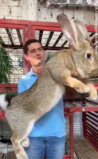 وأبان المقطع مربي الأرانب “دونيزيتي تيكسيرا” وهو يحمل هذا الحيوان الضخم ويجد صعوبة في التحكم بحركاته وثقله وطوله، الذي يبلغ حوالي المتر ، فيما بدت خلفه أقفاص تحوي أرانب أخرى.