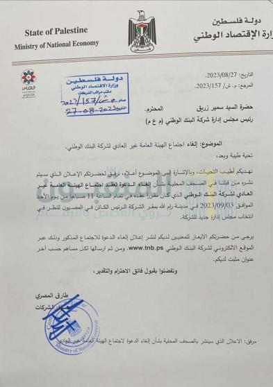 وحصلت منصة "المنقبون" على كتاب وجهته وزارة الاقتصاد إلى رئيس مجلس إدارة البنك الوطني سمير زريق، تبلغه بإلغاء إعلانها الصادر عنها، والقاضي بعقد اجتماع هيئة عامة غير عادي للبنك الوطني لانتخاب مجلس إدارة جديد.
