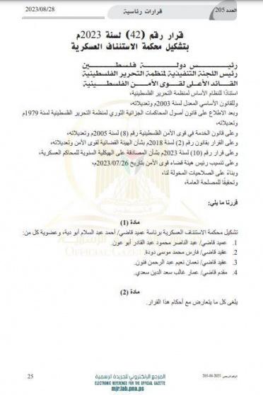 وبحسب ما نشر في الجريدة الرسمية "الوقائع الفلسطينية" في العدد "205"، فإن القرار الرئاسي يقضي بتشكيل المحكمة برئاسة عميد قاضي: أحمد عبد السلام أبو دية وعضوية كل من:
