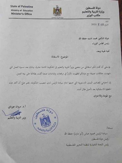 تداولت مواقع "التواصل الاجتماعي"، مساء أمس الأحد، صورة لكتاب استقالة وزير التربية والتعليم مروان عورتاني والتي قدمها لرئيس الوزراء د. محمد اشتية.