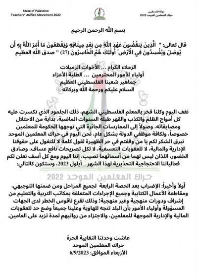 وبين الحراك في بيان له، أن الإضراب سكون بعد الحصة الرابعة لكل المراحل، ومقاطعة الأعمال الكتابية وكل الإجراءات المتعلقة بمكاتب التربية والتعليم من إشراف ودورات.