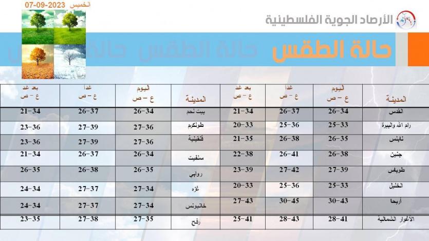من المتوقع أن تكون الأجواء حارة بشكل لافت يوم الخميس، واشد حرارة الجمعة (ذروة الموجة الحارة) حيث تتراوح الحرارة ما بين 35-40 درجة في معظم المناطق بما فيها الجبال والسهول والسواحل وقطاع غزة.