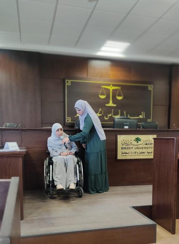 في السياق نفسه،قامت مجموعة من طلاب الجامعة بتنفيذ محاكاة لمحكمة صورية حول قضية امرأة ذات إعاقة مستوحاة من الواقع، وذلك لإبراز أهم الفجوات والتحديات التي تواجه النساء ذوات الإعاقة في الوصول لخدمات قطاع العدالة والتقاضي، فيما عقبت الأستاذة دارين صالحية رئيسة نيابة حماية الأسرة من العنف على مجريات الحالة، وتجربة المحكمة الصورية التي قدمتها مجموعة من الطالبات ، إذ قدمت توجيهات في مجال التقاضي وأسس سير المحاكمات وأدوار المشاركين في المحكمة وفق الأصول القانونية، كما عرجت على الصعوبات والتحديات التي تواجه النساء ذوات الإعاقة مع طرح بعض المقترحات حول تحسين مسار الحالات بما يراعي متطلبات النساء ذوات الإعاقة.