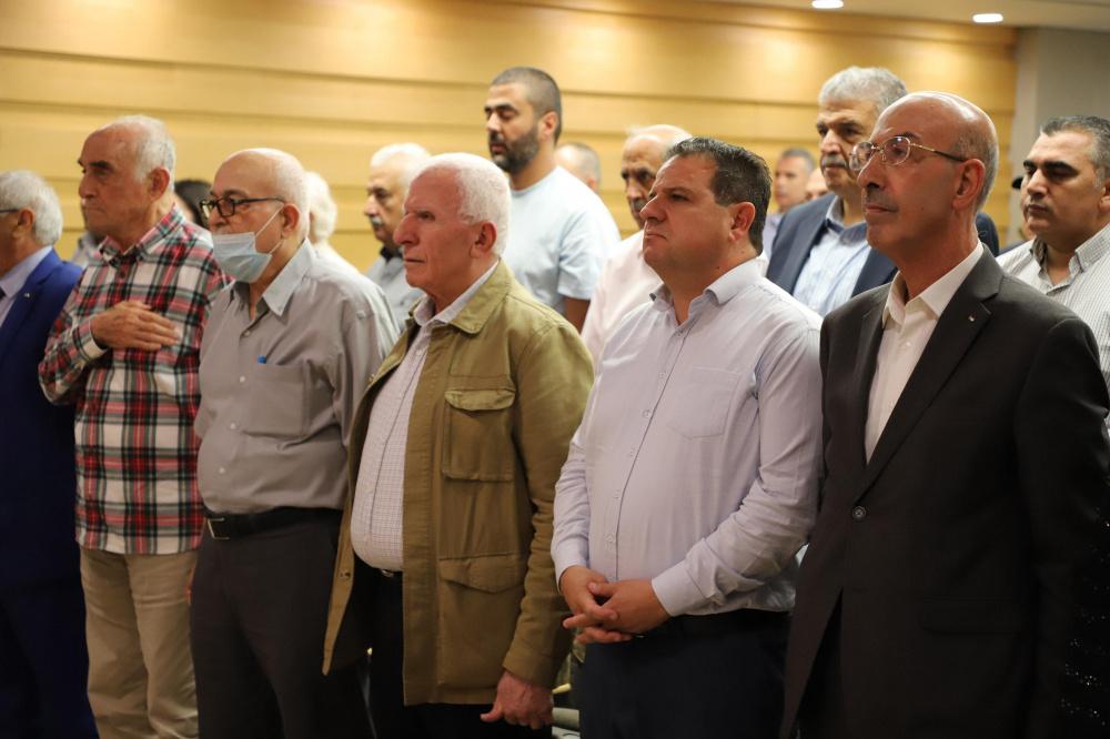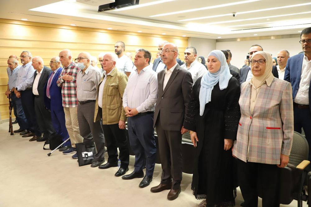 وبدأ الحفل بالنشيد الوطني الفلسطيني، وبعدها بالوقوف دقيقة صمت وقراءة الفاتحة على روح الرئيس الشهيد ياسر عرفات وكل الشهداء.