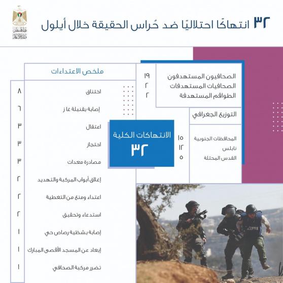 رصدت وزارة الإعلام 32 انتهاكًا احتلاليًا بحق الصحافيين الفلسطينيين خلال أيلول الماضي، إذ استهدف جيش الاحتلال الإسرائيلي (19) صحافيًا بينهم صحافيتين وطاقمين.