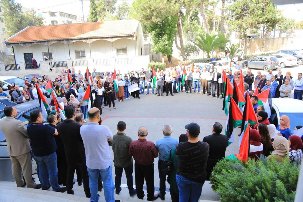 ورفع المشاركون شعارات منددة بجرائم الاحتلال المتواصلة التي تسببت بارتقاء آلاف الأطفال والنساء والمواطنين الفلسطينيين عموماً، واستهداف المدارس والجامعات والطلبة والكوادر التعليمية، مطالبين العالم الحر بمؤسساته الإنسانية والقانونية والأممية للتحرك الفوري لوقف جرائم الحرب التي يرتكبها الاحتلال.